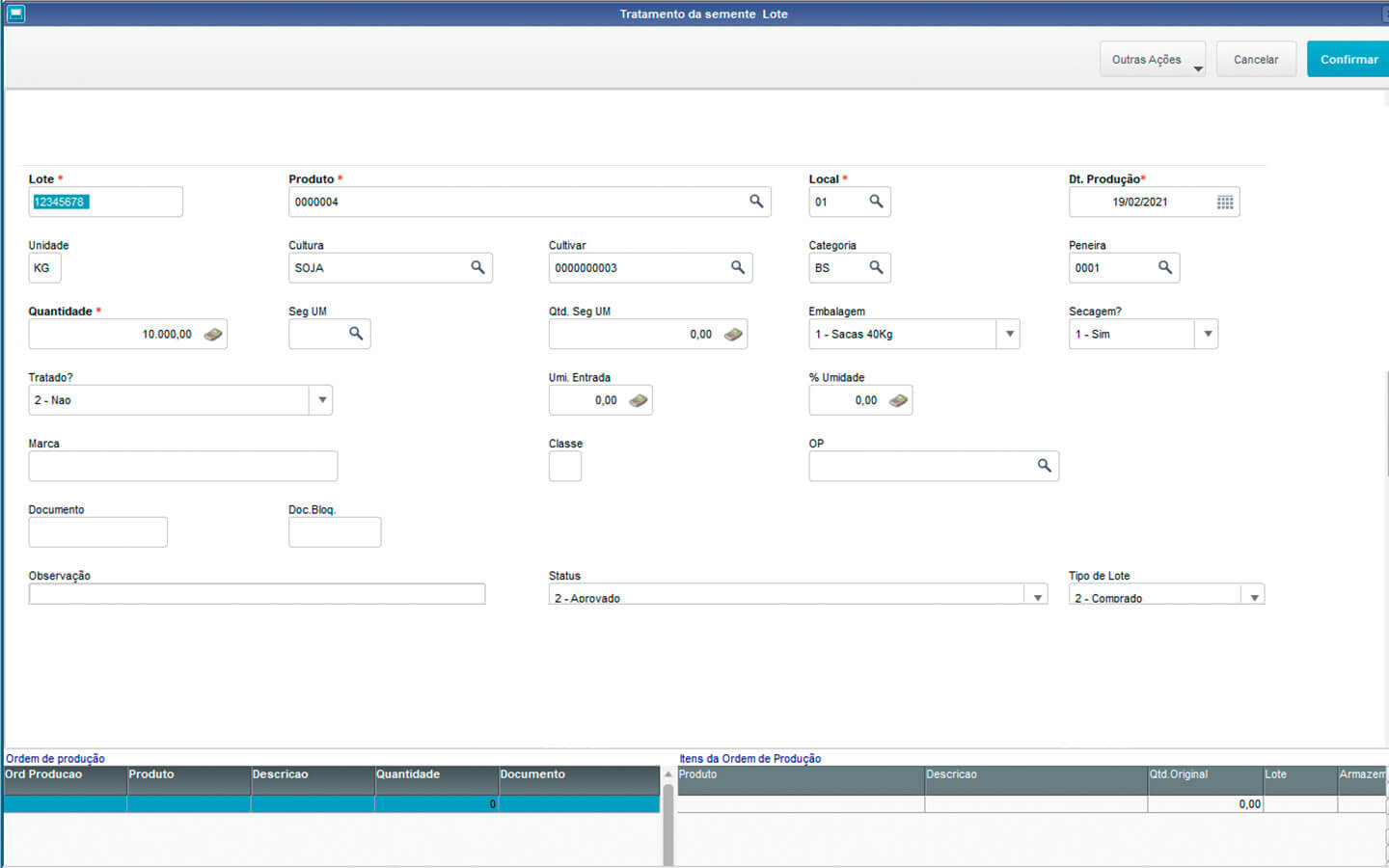 Gere ordens de produção com reporte dos lotes beneficiados e realize processos como pré-limpeza, secagem, separação por peneira, ensaque e muito mais.