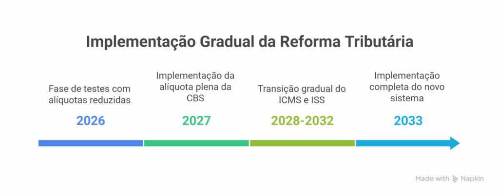 A implementação da reforma tributária sobre o consumo será feita de forma gradual, para que empresas e sistemas possam se adaptar sem rupturas. O cronograma já está definido em lei e prevê um período de coexistência entre o modelo atual e o novo até a adoção plena em 2033.