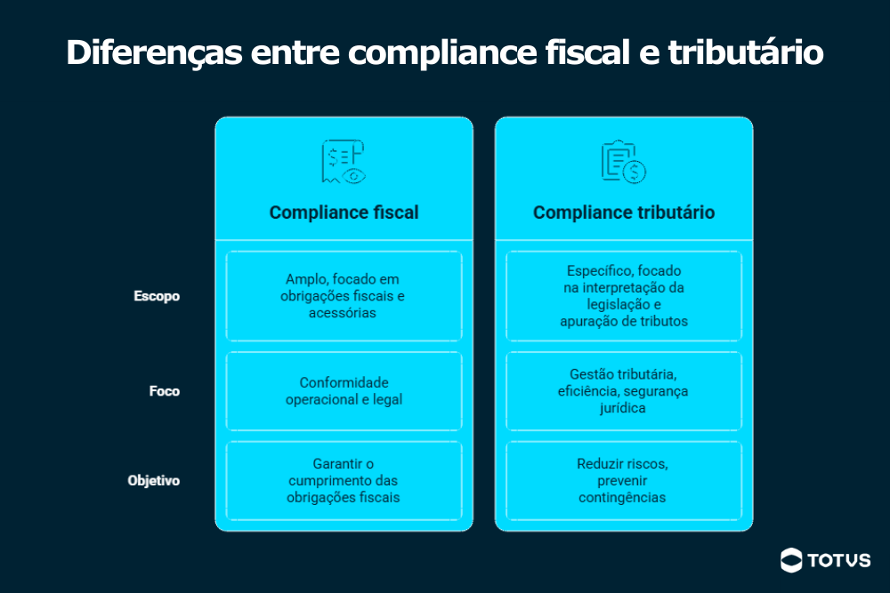 A principal diferença entre compliance fiscal e tributário é o escopo: enquanto o fiscal tem uma atuação mais ampla, o compliance tributário foca em entregas mais específicas, voltadas à correta interpretação da legislação e apuração de tributos.
