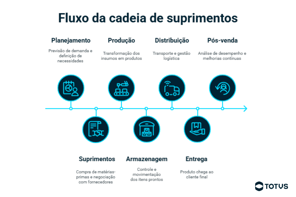 Nestas etapas, existem diversos processos importantes. Entenda o fluxo da cadeia de suprimentos: