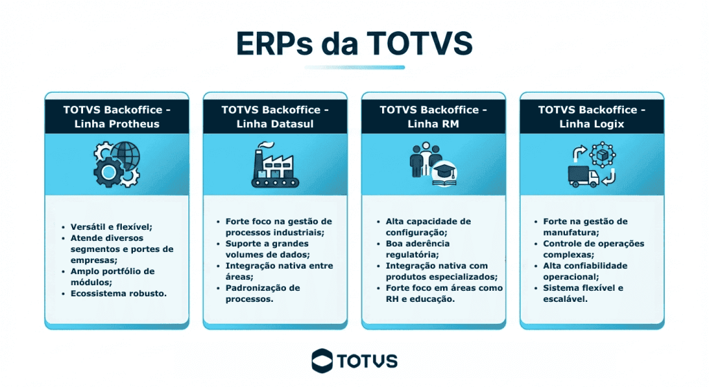 | TOTVS Backoffice – Linha Logix | Médias e grandes empresas | Indústria com processos avançados | Gestão detalhada da manufatura; controle rigoroso de processos | Quando a empresa possui produção complexa, com necessidade de robustez e profundidade funcional |