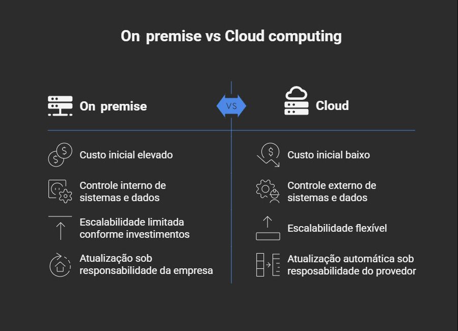 | Infraestrutura | Demanda servidores e estrutura física própria | Tem infraestrutura gerenciada pelo provedor de nuvem |