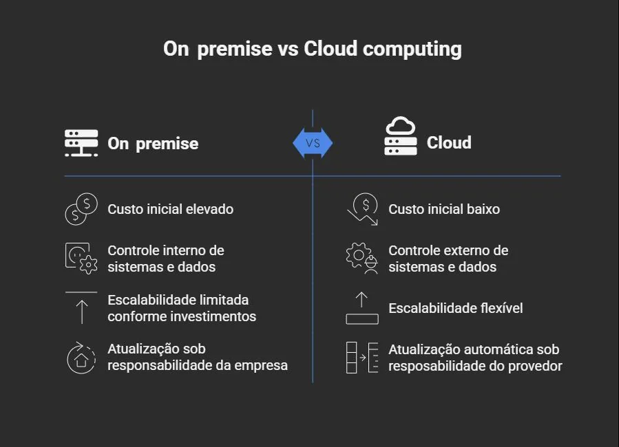 | Controle e personalização | Controle total sobre os sistemas e maior possibilidade de personalização | Menor controle direto, uma vez que os dados ficam armazenados no provedor terceirizado |