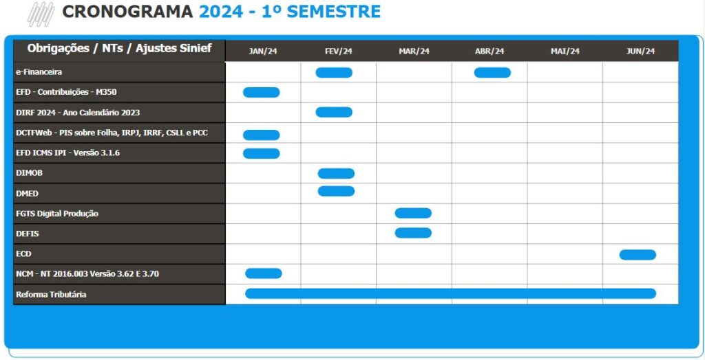 Pensando nisso, elaboramos um cronograma das obrigações para o ano de 2024, destacando as principais alterações e novidades para que você não perca nenhum detalhe.