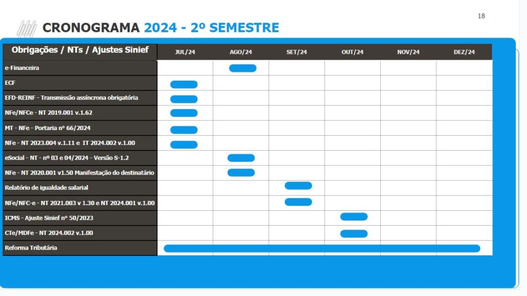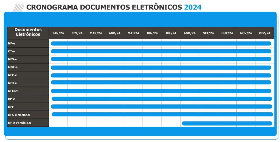 Dentre os diversos Documentos Fiscais Eletrônicos, é importante que o contribuinte se mantenha atualizado e fique atento às mudanças. Neste ano de 2024, temos novidades aos novos Documentos Fiscais Eletrônicos, como é o caso das NFCom e NF3e além das implementações e alterações das diversos Ajustes Sinief e Notas Técnicas relativas a NFe, NFCe, NFSe, CTe e MDFe, veja o cronograma abaixo:
