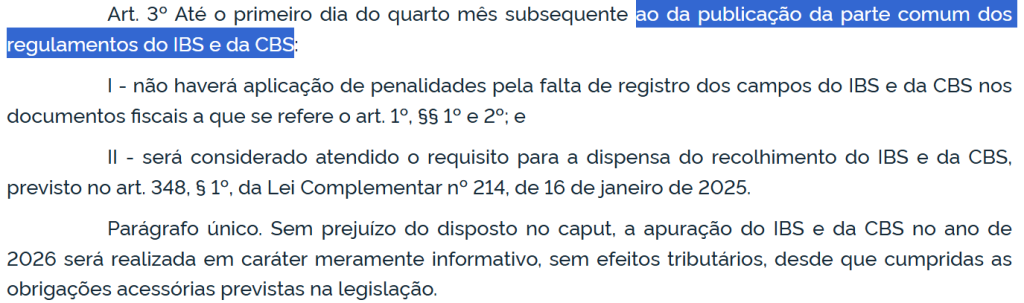 Portanto, enquanto tal(is) regulamento(s) não forem publicados, não ha que se falar em aplicação de penalidades, pois de acordo com o Ato Conjunto RFB/CGIBS 1/2025, o prazo para vigorar os efeitos só começa a contar no 1º dia do 4º mês subsequente à publicação de tal Regulamento.