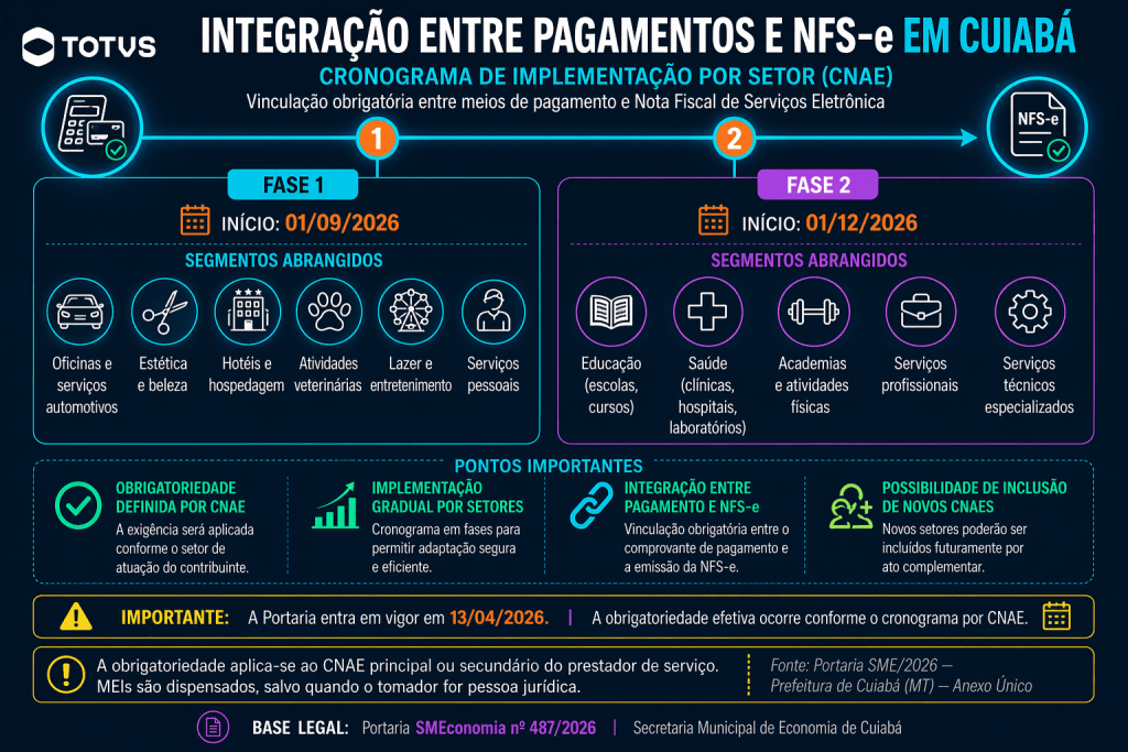 A Secretaria Municipal de Economia de Cuiabá publicou, em 13 de abril de 2026, a Portaria SMEconomia nº 487/2026, que regulamenta a integração entre os meios de pagamento eletrônicos e a Nota Fiscal de Serviços Eletrônica (NFS-e), além de estabelecer os procedimentos técnicos, operacionais e o cronograma de implementação aplicável aos contribuintes do ISSQN.