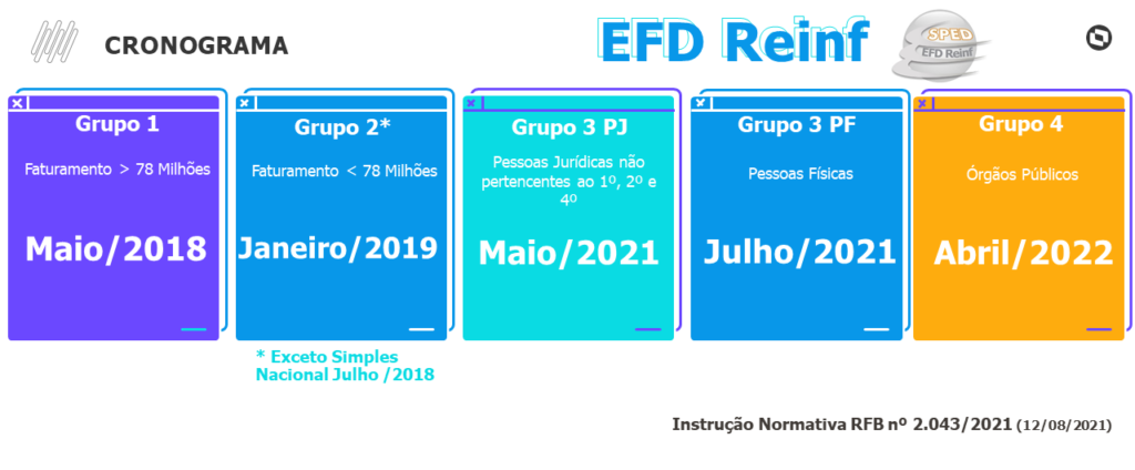 A Receita Federal estabelece através da publicação da Instrução Normativa 2.043 de 13/08/2021, alterações no cronograma de entrega para o 4º grupo, como também regras de apresentação e a penalidade no caso de não apresentação da EFD-REINF, Escrituração Fiscal Digital de Retenções e Outras Informações Fiscais.