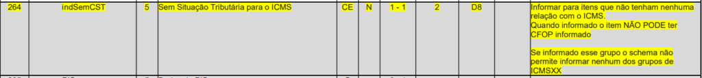 A Nota Técnica na versão 1.01 ajustou o texto da NT anterior para corrigir que o campo “indSemCST” deve usar o domínio D8, ou seja, só aceita valor igual a 1.