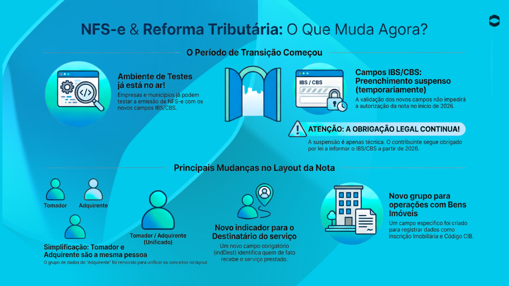 Além disso, A NT 004 ressalta que a suspensão da obrigatoriedade dos grupos IBSCBS não tem relação com o prazo de 1º de janeiro de 2026 para que os entes municipais se integrem à plataforma NFS-e. Este prazo permanece em vigor, inclusive com a possibilidade de sanções, como a suspensão de transferências voluntárias, para aqueles que não se integrarem.