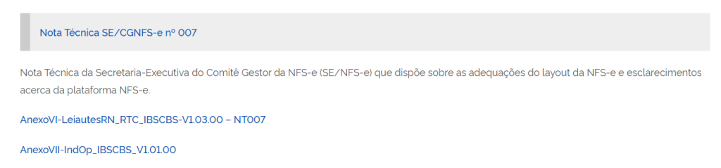 NT SE/CGNFS-e nº 004: Foi a primeira versão efetiva do layout adaptado à Reforma Tributária. Seu foco foi viabilizar o piloto, criando a estrutura básica para recepção das informações de IBS e CBS na NFS-e.
