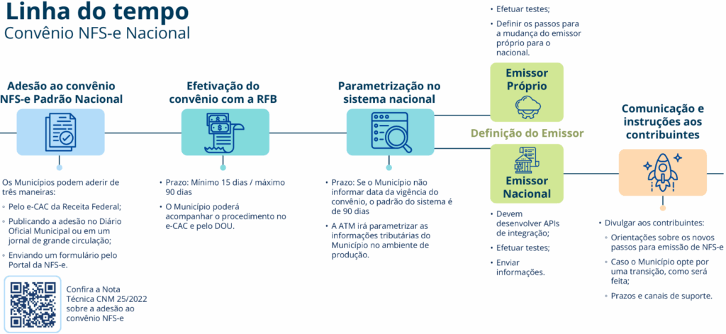 O cronograma de implementação envolve cinco etapas: adesão ao convênio, efetivação junto à RFB, parametrização no ambiente de produção, definição do emissor (se próprio ou nacional) e comunicação aos contribuintes, organizadas na linha do tempo apresentada pela CNM.