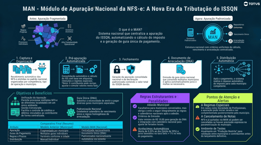 O MAN consiste em um módulo do sistema nacional que centraliza a apuração do ISSQN a partir das notas fiscais de serviço emitidas no padrão nacional, automatizando o cálculo do tributo e a geração do documento de arrecadação. Na prática, substitui o modelo fragmentado atualmente existente, no qual cada município possui regras, sistemas e processos próprios, por uma estrutura nacional padronizada, com critérios uniformes de cálculo, vencimento e arrecadação. Seu desenho busca enfrentar um dos principais desafios estruturais do ISS, que é a descentralização municipal, promovendo maior uniformidade operacional e previsibilidade para os contribuintes.