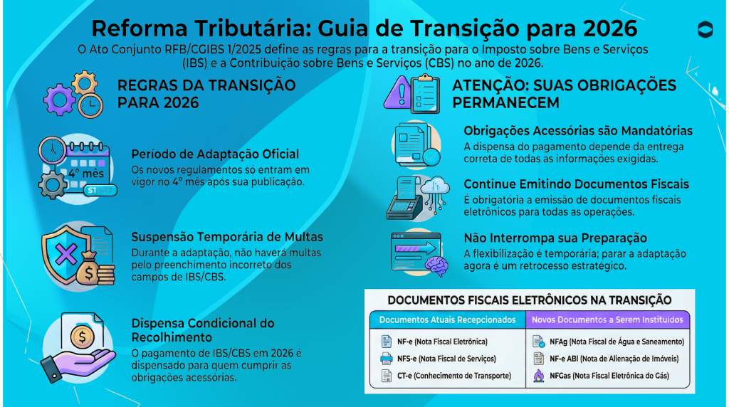 Hoje, 23 de dezembro de 2025, foi publicado o Ato Conjunto RFB/CGIBS 1/2025, que estabelece os documentos fiscais que serão recepcionados pelos regulamentos do IBS e da CBS, juntamente com os prazos para o ano de 2026.