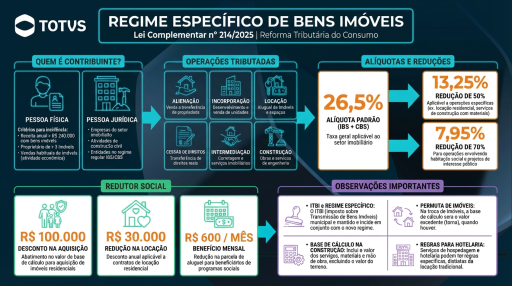 O material foi elaborado no âmbito do Grupo de Trabalho 11 (GT 11) do Conselho Técnico das Administrações Tributárias Municipais (CTAT) e tem como objetivo analisar o Regime Específico de Bens Imóveis, disciplinado pelos arts. 251 a 270 da Lei Complementar nº 214/2025, que regulamenta a Emenda Constitucional nº 132/2023.