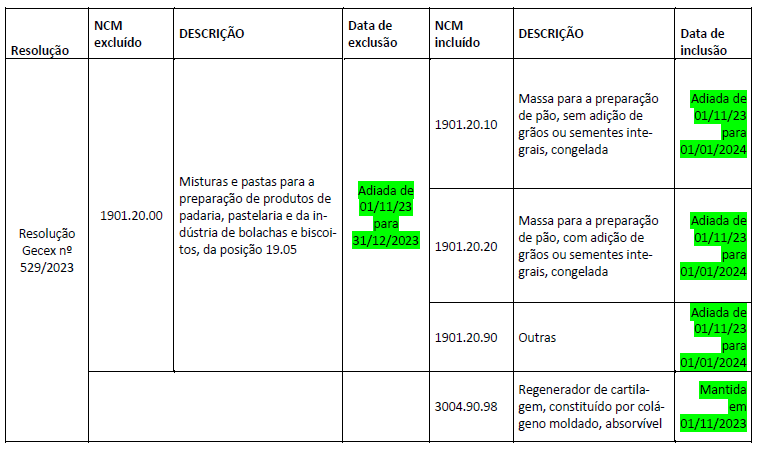 No mês de agosto de 2023, foi divulgada uma alteração, por meio da versão 3.60, e neste mês de outubro a versão 3.61. Na atual versão publicada, a 3.62, houve a manutenção da inclusão do código NCM 3004.90.98 para 01/11/2023, alteração da data de produção dos NCMs incluídos na versão anterior para 01/01/2024 e, por fim, alterou a data de exclusão do código NCM 1901.20.00 para 31/12/2023, conforme quadro abaixo.