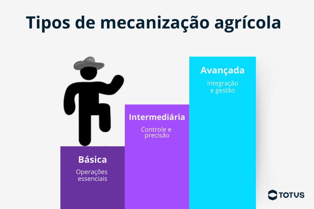 A mecanização pode assumir diferentes níveis, de acordo com o porte da propriedade, o tipo de cultura e o grau de adoção de tecnologia. De forma geral, é possível classificá-la em três tipos principais: