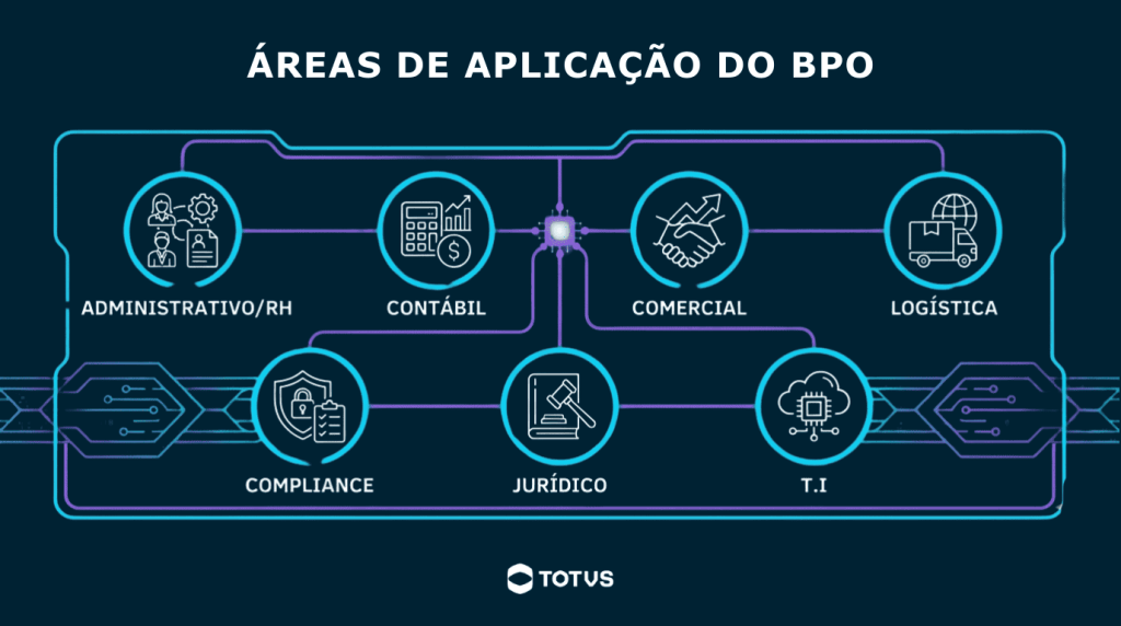 - BPO de TI: abrange a gestão de infraestrutura tecnológica, suporte técnico, segurança da informação, monitoramento de sistemas, manutenção de servidores e gestão de ativos de tecnologia.