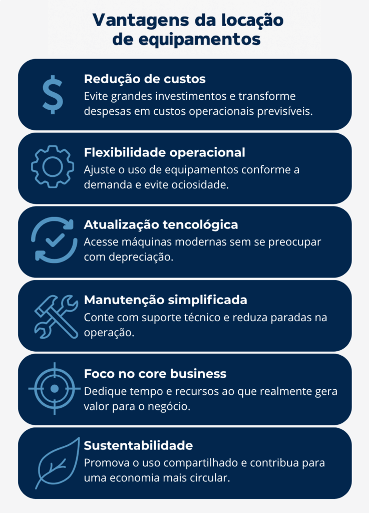 Um dos principais motivos que levam empresas a optar pela locação de máquinas e equipamentos é a redução de custos fixos. Ao invés de realizar grandes investimentos em ativos próprios, o modelo converte o gasto em despesa operacional, reduzindo a necessidade de imobilizar capital e melhorando o fluxo de caixa.