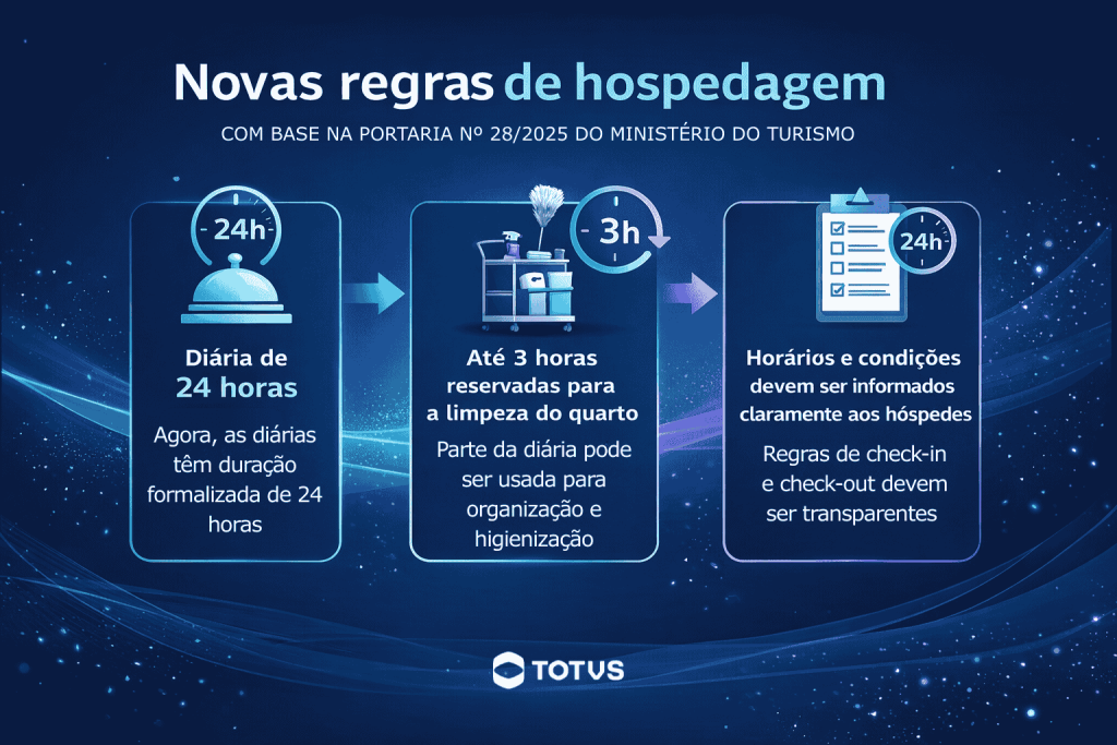 Desde dezembro de 2025, a Portaria nº 28/2025 do Ministério do Turismo formalizou a diária de 24 horas em hospedagens, incluindo até três horas destinadas à limpeza, padronizando regras de entrada e saída.