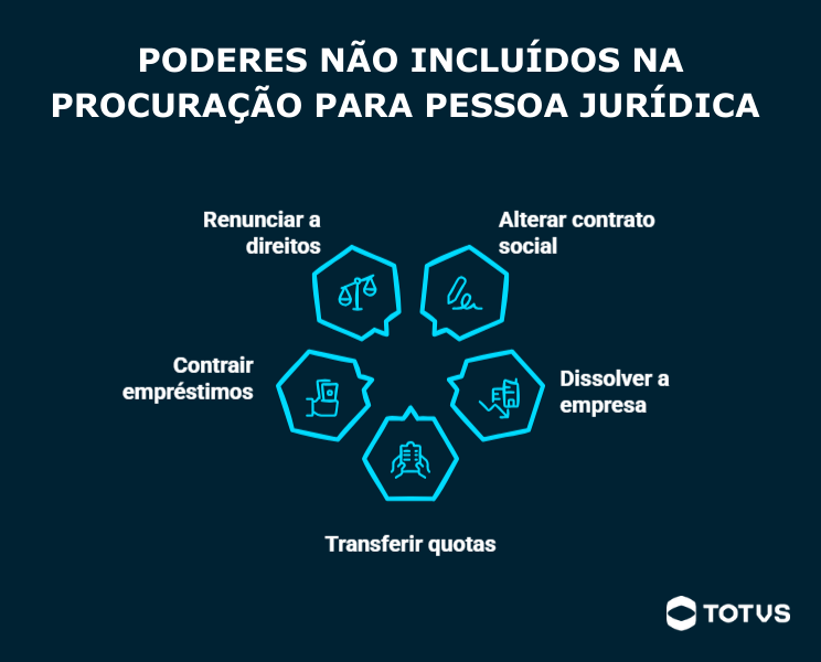 Existem alguns poderes que não podem ser incluídos em uma procuração de pessoa jurídica, pois exigem a manifestação expressa da vontade da empresa.