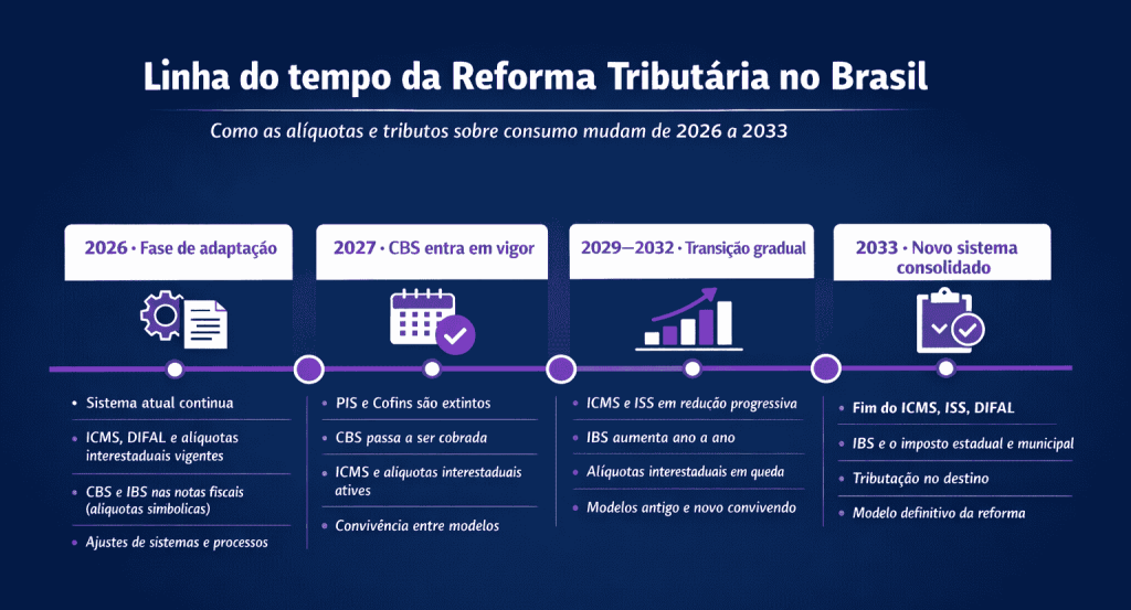 Embora a alíquota interestadual continue existindo durante parte do período de transição, o seu papel muda completamente. A partir de 2026, as empresas já precisam operar sabendo que esse modelo tem data para acabar.