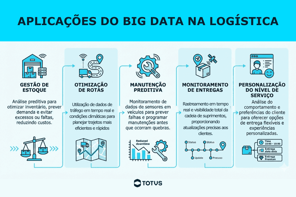 ERPs modernos, como os da TOTVS, permitem conectar informações de estoque, transporte, pedidos e fornecedores, o que facilita a análise de grandes volumes de dados e garante uma visão integrada da cadeia logística.