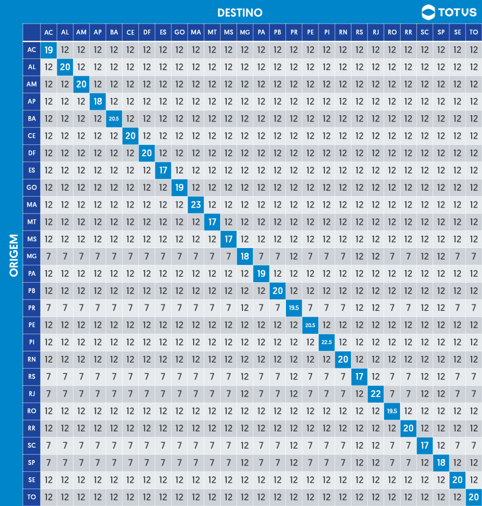 - 7% nas operações com origem nos estados do Sul e Sudeste (exceto Espírito Santo) e destino para Norte, Nordeste, Centro-Oeste e Espírito Santo;