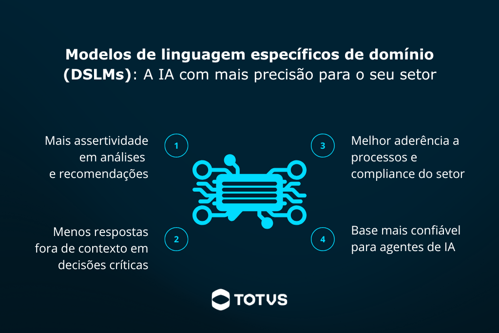 O Gartner explica que os DSLMs são treinados ou ajustados com dados de uma indústria, função ou processo, entregando mais precisão, menor custo e melhor conformidade em tarefas especializadas.