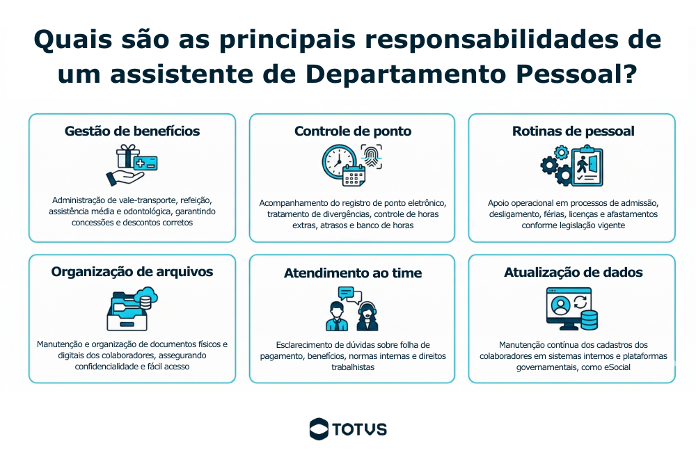Saiba quais são as principais responsabilidades de um assistente de Departamento Pessoal, lembrando que o profissional atua como apoio ao lado de analistas e coordenadores: