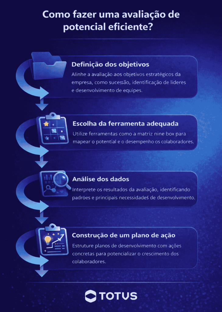 O primeiro passo é alinhar a avaliação de potencial aos objetivos estratégicos da empresa. Ela pode ser utilizada para identificar futuros líderes, estruturar sucessões, melhorar a alocação de talentos ou apoiar o desenvolvimento das equipes.