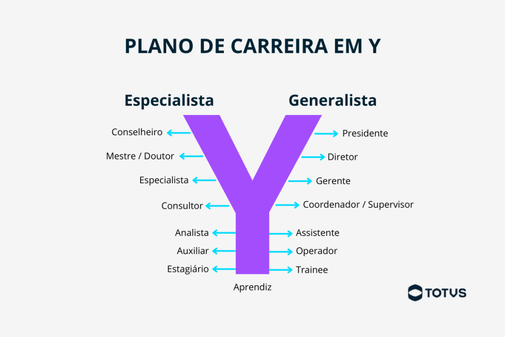 O plano de carreira em Y é um modelo de gestão de carreira que permite aos profissionais seguir dois caminhos principais de desenvolvimento: o generalista e o especialista.