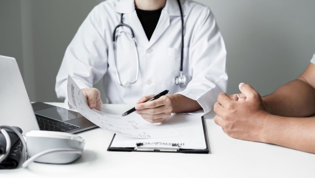 O colaborador passa por uma anamnese, em que o médico pergunta sobre doenças preexistentes e uso de medicamentos para entender o histórico do colaborador. Depois, é realizada uma avaliação física.