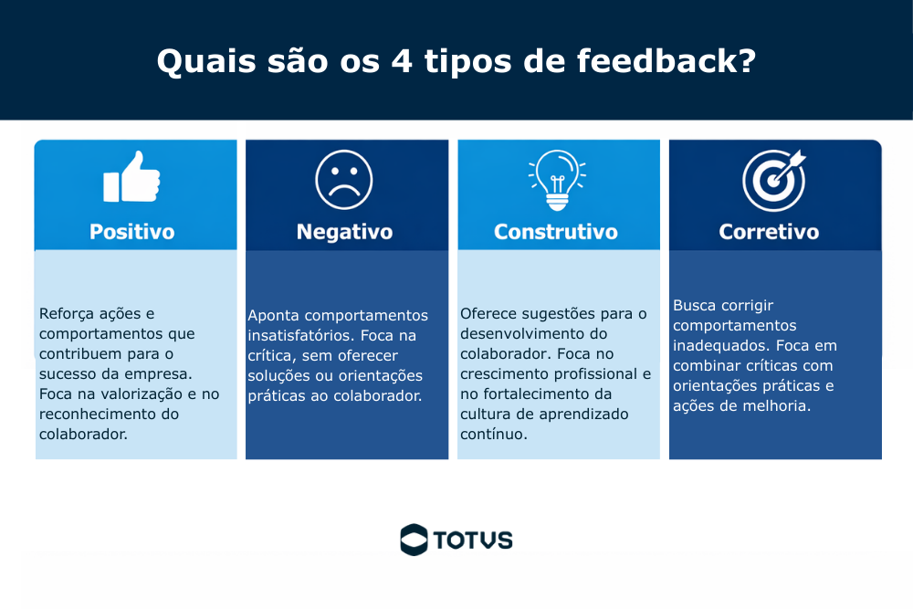 Dentro dessas categorias, existem diferentes formas de oferecer um feedback, mas vamos focar aqui nos pilares gerais. Entenda quais são os 4 tipos de feedback: