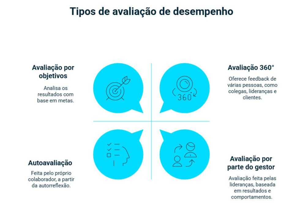 - Avaliação por objetivos: mede o desempenho com base no cumprimento de metas previamente estabelecidas, focando nos resultados alcançados em determinado período.