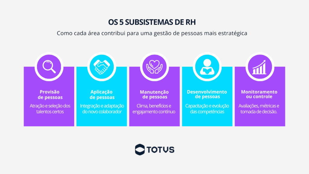 Cada subsistema apoia os outros, formando uma estrutura integrada que fortalece a atuação do RH e amplia seu impacto na empresa.