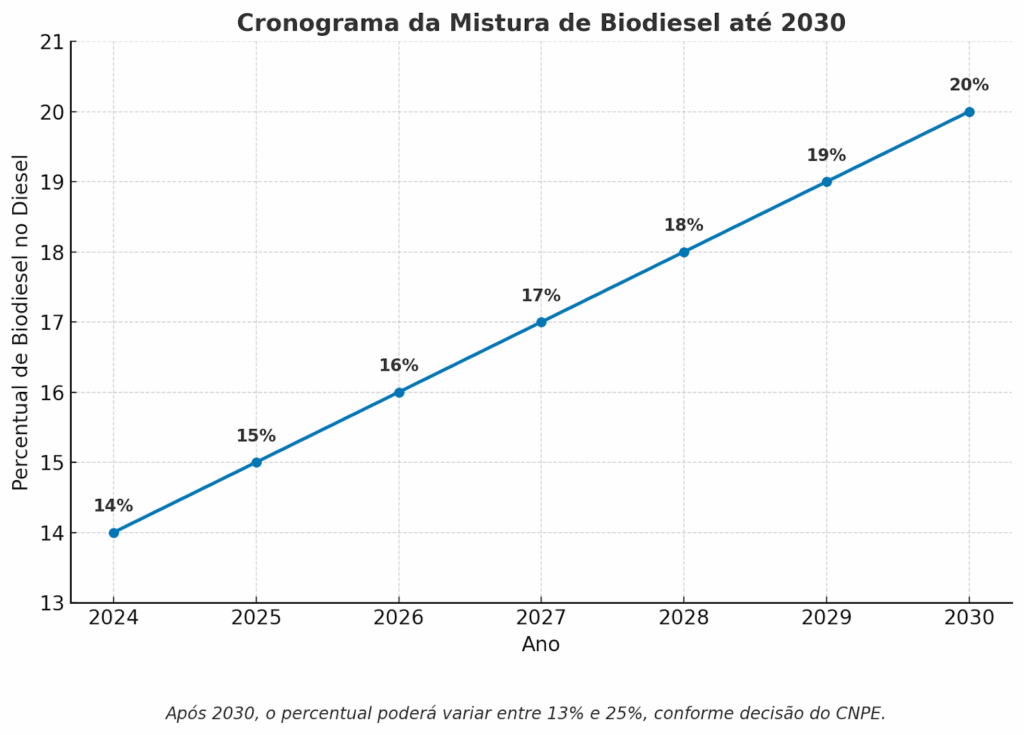 - De acordo com a nota de esclarecimento da EPE, o biodiesel, que já era misturado ao diesel, inicia em 14% (atual) e deverá subir 1 ponto percentual a cada ano a partir de março de 2025 até alcançar 20% em março de 2030. Depois disso, poderá variar entre 13% e 25% conforme decisão do CNPE.