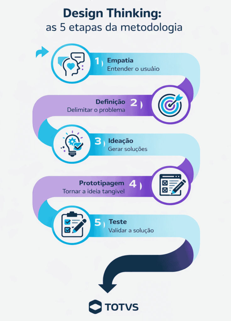 Na TOTVS, o Design Thinking é utilizado como abordagem para aprimorar continuamente a experiência dos clientes e a evolução dos seus produtos. Em vez de partir apenas de decisões internas ou de especificações técnicas, a empresa adota uma escuta ativa dos usuários para entender como as soluções são utilizadas no dia a dia e quais desafios precisam ser superados.