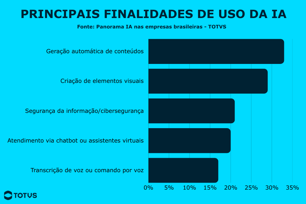 Não à toa, o principal uso de IA por organizações no Brasil está relacionado a tarefas generativas, como mostra o estudo “Panorama IA nas empresas brasileiras”, da TOTVS.