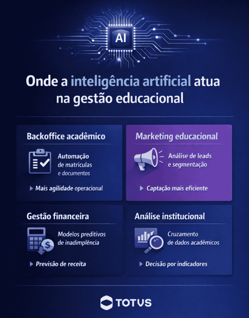 - Análise institucional: a IA cruza dados acadêmicos, financeiros e administrativos para gerar indicadores mais completos de desempenho.