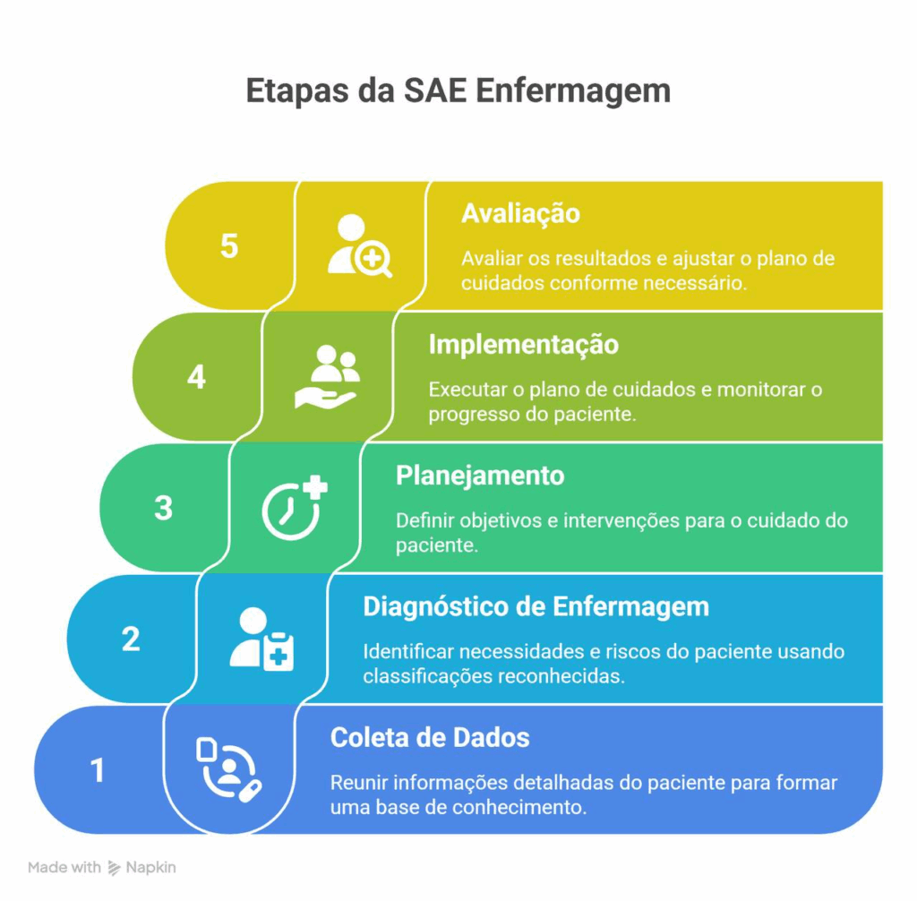 A aplicação da SAE se desenvolve em cinco etapas que estruturam o processo de cuidado em saúde. Cada fase é interdependente e, juntas, elas formam um ciclo contínuo que vai da coleta de dados iniciais até a avaliação dos resultados obtidos.