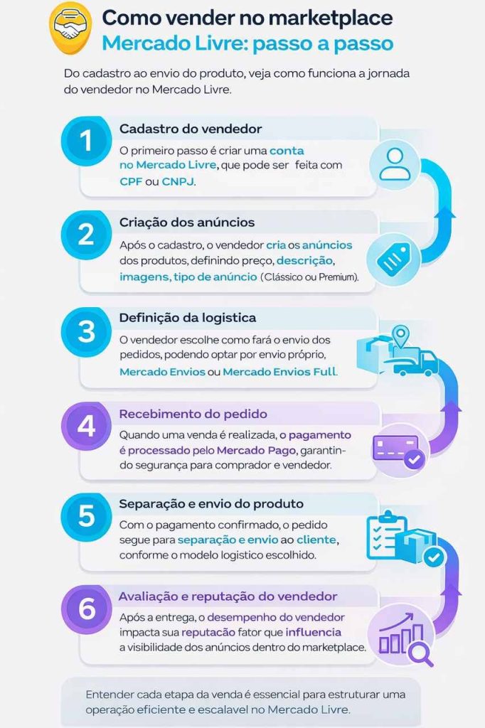 O processo começa com o cadastro do vendedor, que pode ser feito tanto por CPF quanto por CNPJ. A partir disso, o lojista pode criar anúncios, definir preços, escolher formas de envio e gerenciar pedidos por meio do painel da plataforma.