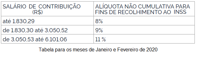 A contribuição dos segurados empregados, inclusive o doméstico e do trabalhador avulso, relativamente aos fatos geradores referentes às competências janeiro e fevereiro de 2020, será calculada mediante a aplicação da correspondente alíquota sobre o salário de contribuição mensal, de forma não cumulativa, de acordo com a tabela: