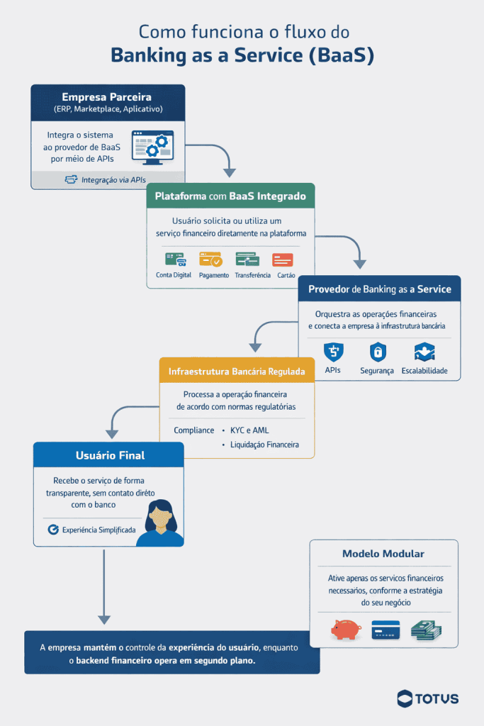 Nesse modelo, a instituição financeira ou o provedor de BaaS é responsável por toda a base regulatória, compliance, segurança e liquidação financeira. Já a empresa parceira integra esses serviços ao seu próprio produto, normalmente por meio de APIs, oferecendo a experiência financeira sob sua própria marca.