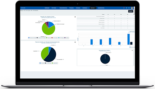 Tenha uma visão completa da atividade comercial da sua incorporadora, com gráficos e relatórios de vendas detalhados por empreendimento, por equipe, por corretores e por parceiros.