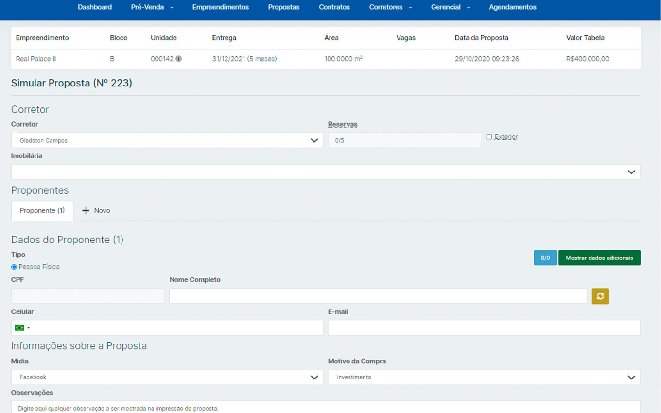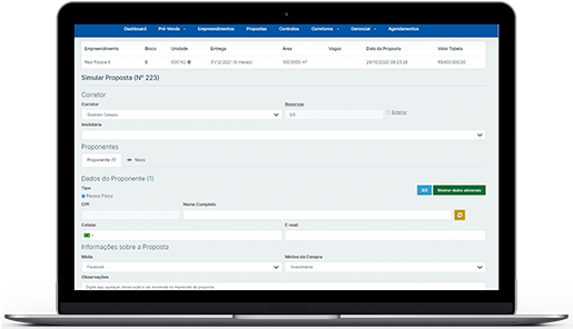 Organize todas as etapas do processo de criação de propostas, desde a negociação até a formalização e impressão da proposta. Você pode gerar simulações para negociar com os clientes e o cálculo das condições de financiamento é automático.