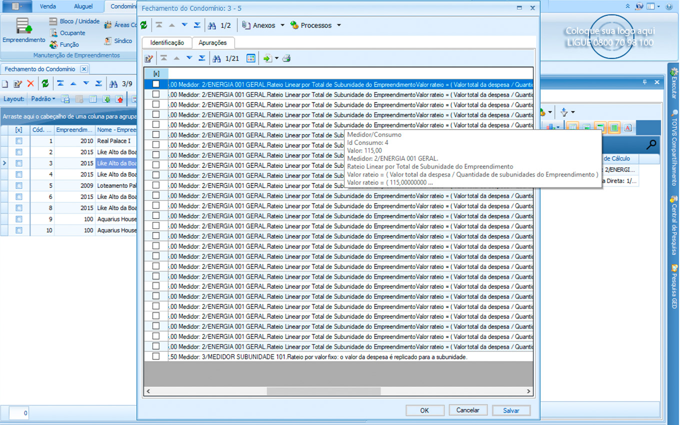 Faça o controle dos medidores de luz, água e gás do condomínio, registrando os dados de cada equipamento instalado nas unidades e nas áreas comuns, organizando as despesas que serão lançadas nas contas de consumo.
