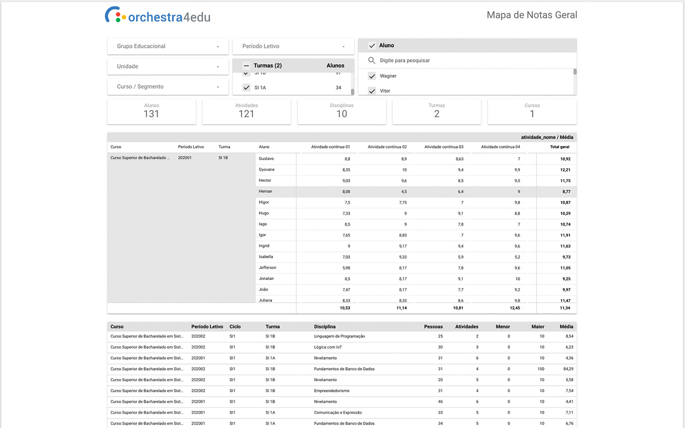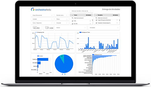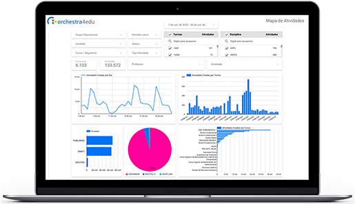 Controle a execução do planejamento pedagógico por meio de um mapa de atividades com informações sobre alunos e professores, contemplando a entrega de todas as tarefas, divididas por status, tipo e data de criação.