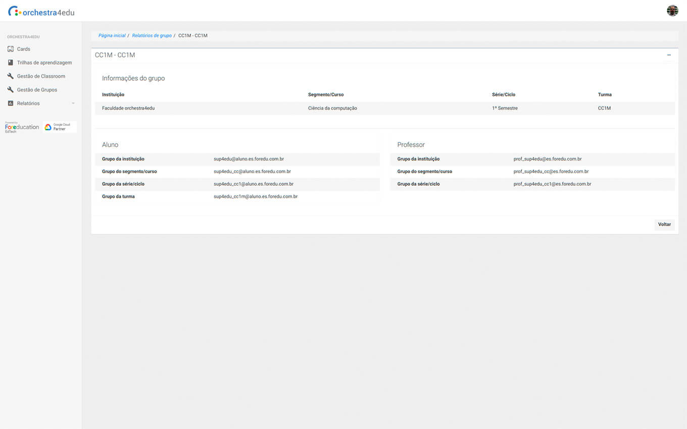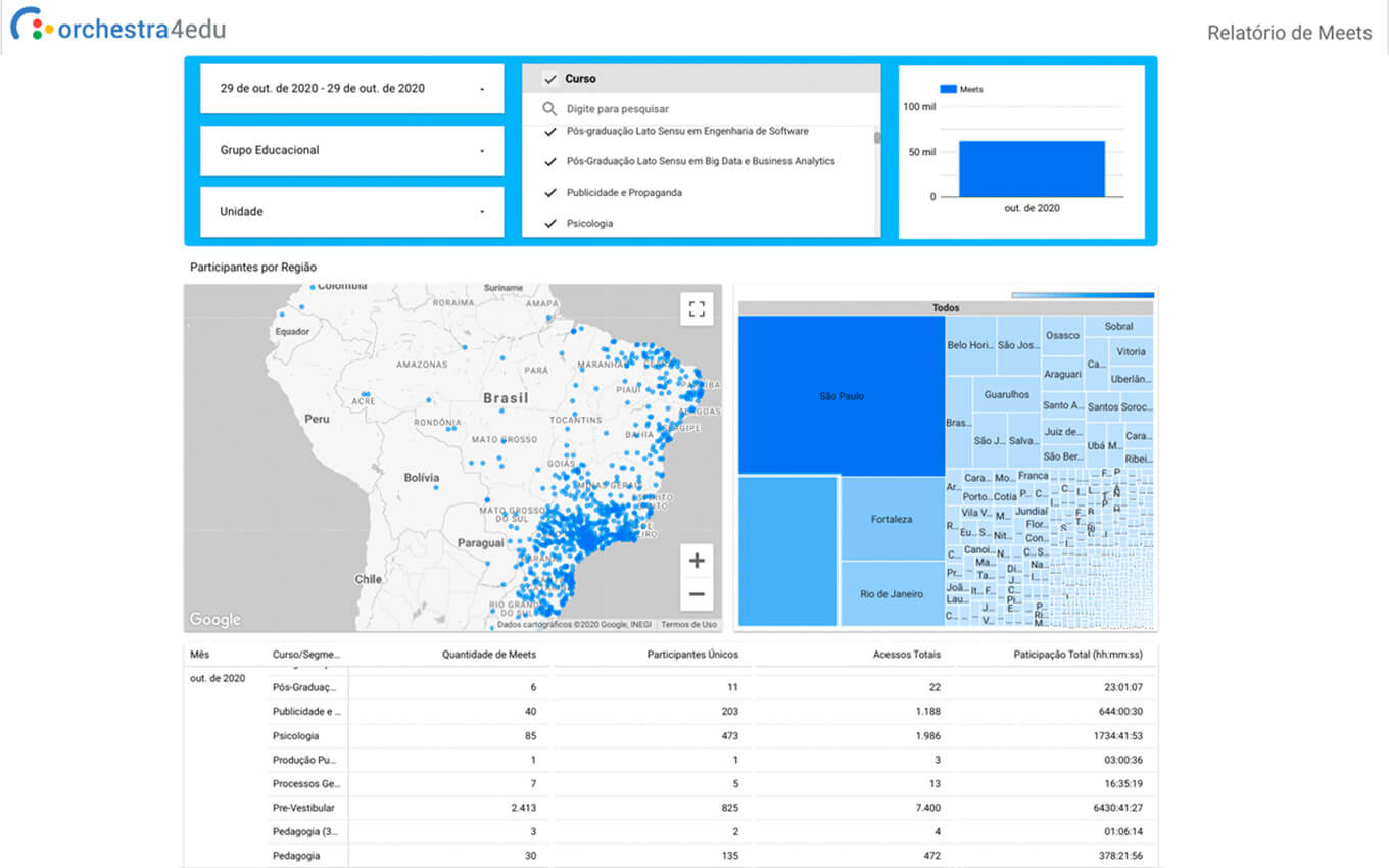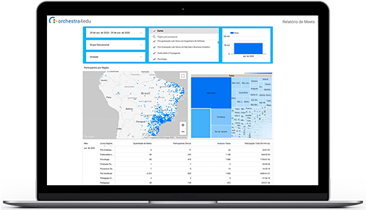 Fique por dentro das conferências e aulas online da sua instituição de ensino, realizadas no Google Meet, e tenha em mãos diversas informações como o tempo total de cada reunião, tempo de participação dos usuários e a identificação do perfil de aluno ou professor.