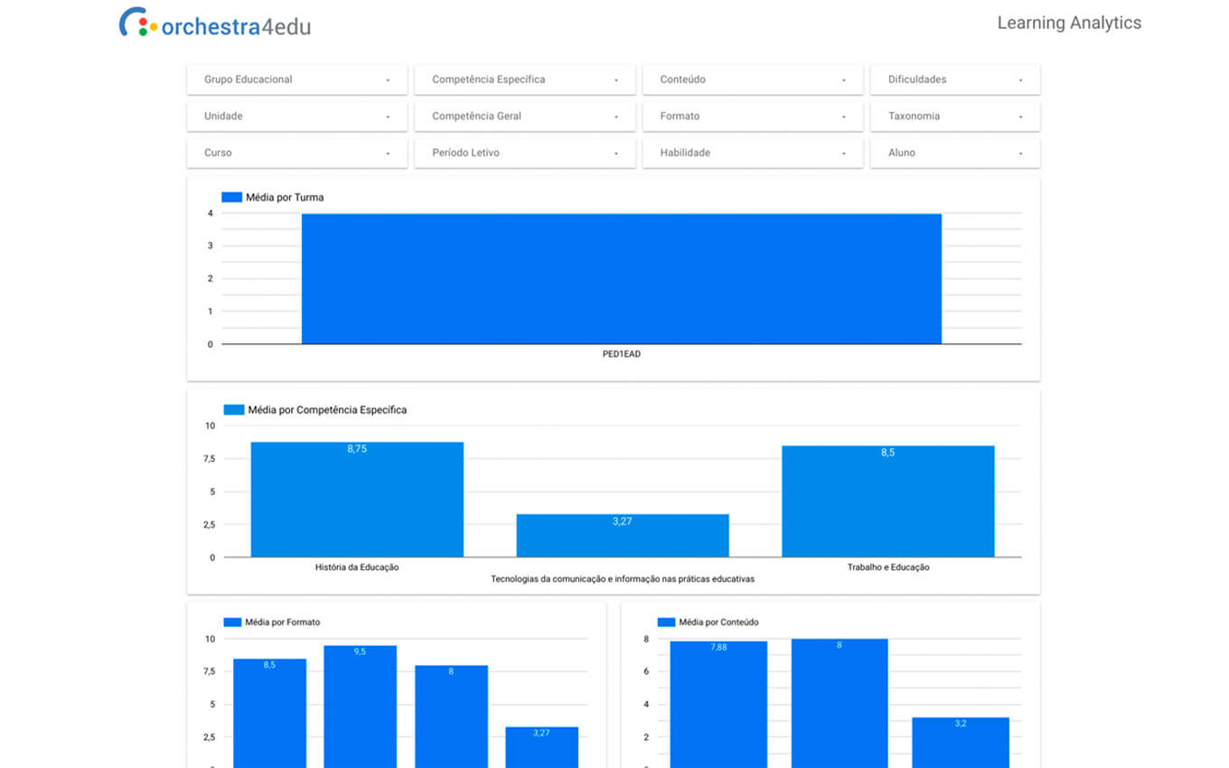 Acompanhe o desenvolvimento dos seus alunos por meio do relatório Learning Analytics, que reúne todos os dados sobre o desempenho dos estudantes em um dashboard dinâmico e intuitivo.